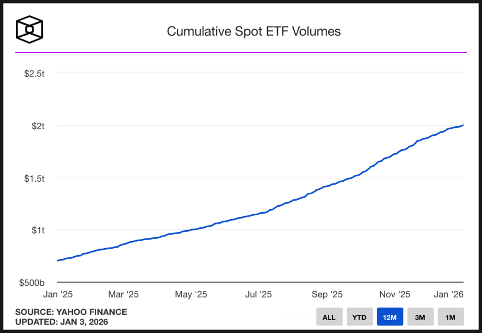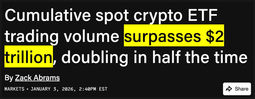 한편 미국에서 거래되는 현물 크립토 ETF들의 누적 거래대금이 결국 2조 달러를 넘겼다는 소식도 나왔는데요. ETF가 처음 출시된 게 2024년 1월이니까, 2년도 채 안 돼서 이레벨에 도달한 겁니다.
