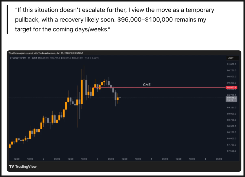 어쨌든 정리하자면 주말 간 미국과 베네수엘라 간 군사 행동에도 불구하고 암호화폐 시장은 위기를 잘 넘긴 것 같은데요. 일시적으로 급락이 발생했을 때 어떤 애널리스트는 '상황이 더 악화되지 않는다면 이번 움직임은 일시적인 조정일 가능성이 크다'며, 이 경우 단기 목표 구간으로는 9만6천 달러에서 10만 달러를 제시했는데요.