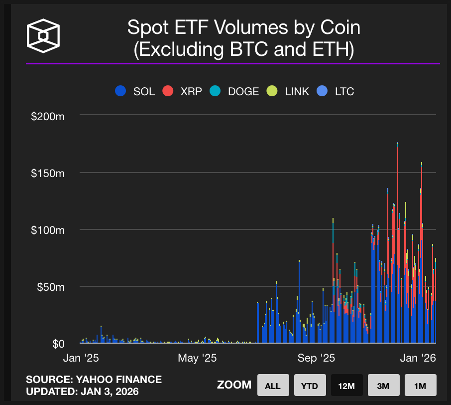 ETF 종류가 늘어난 것도 큰 역할을 했습니다. 작년 9월, 미국 증권거래위원회가 ETF 상장 기준을 단순화하면서 승인 기간이 기존 최대 240일에서 짧게는 75일 수준까지 줄어들었는데요. 그 이후 비트코인과 이더리움뿐 아니라 솔라나, XRP, 도지코인, 라이트코인, 헤데라, 체인링크를 추종하는 현물 ETF들이 잇따라 출시됐습니다. 이 중에서는 XRP ETF가 특히 강세를 보였고, 지난해 11월 출시 이후 순유입만 12억 달러를 끌어모았습니다.
