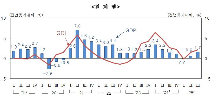 ㅇ 경제성장률이 높아지고 있다. 2022년 이후 우리 경제는 물가 급등에 대응한 고금리정책으로 거의 성장하지 못했다. 물가가 점차 안정되고 기준금리가 인하되면서 경기 부진이 완화되는 모습이다. 특히 2025년 3분기에는 민생회복 소비쿠폰 등 정부 지원으로 전기 대비 1.3%의 높은 성장률을 보였다.