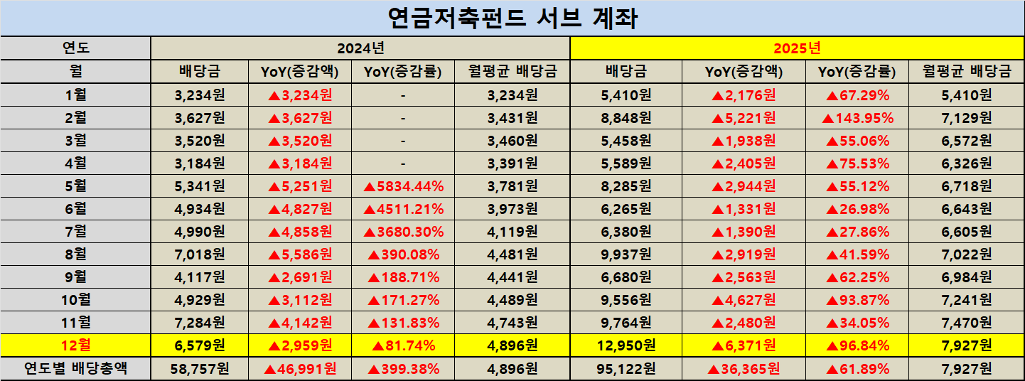 연금저축 계좌는 배당 규모가 크지 않더라도 ‘절세 구조’ 안에서 재투자를 반복할 수 있다는 점이 핵심입니다. 2025년 연금저축 메인 계좌의 연간 배당금은 217,054원이며 월평균 배당금은 18,088원입니다. 서브 계좌는 연간 95,122원 월평균 7,927원으로 기록되었습니다. 이 두 계좌는 속도보다 지속성이 중요해서 매달의 변동보다 누적 그래프가 완만하게 우상향하는지에 더 집중하고 있습니다.