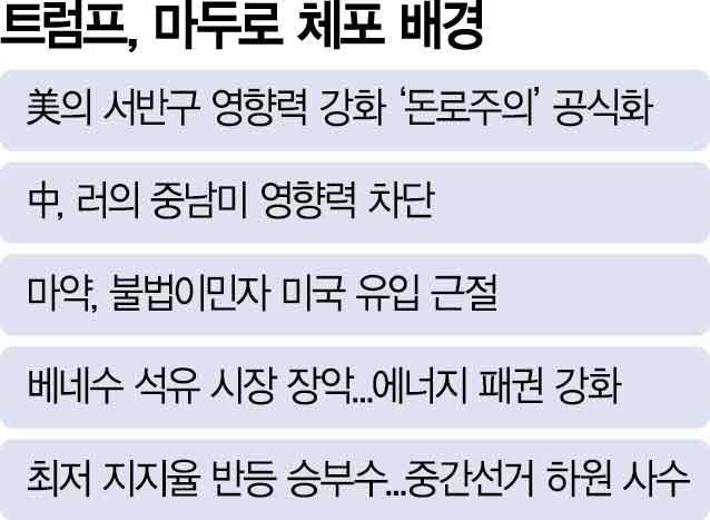 도널드 트럼프 미국 대통령의 니콜라스 마두로 베네수엘라 대통령 축출에는 ‘돈로 독트린’ 공식화, 베네수엘라 석유 시장 장악, 지지율 반전 승부수 등 다각적인 포석이 담겨 있다는 분석이 나옴