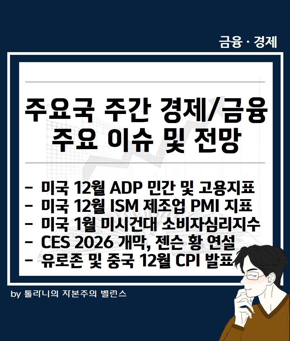 이에 'CES 2026 개막, 젠슨 황 연설, 미국 12월 고용지표 발표 등 주간 증시 일정 및 경제·금융 이슈' 관련하여 언론 보도 및 국제금융센터 보고서를 통해 좀 더 자세히 알아보도록 하겠습니다.