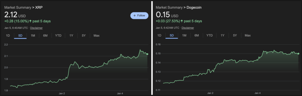 그중에서도 XRP와 도지코인은 지난 며칠 동안 10%가 넘는 상승률을 보이고 있어 화제입니다.
