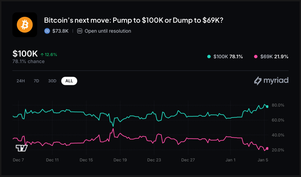 예측 시장에서는 비트코인이 6만 9천 달러로 떨어지는 것과 10만 달러로 오를 확률 중 후자의 확률을 80% 이상으로 보고 있습니다.