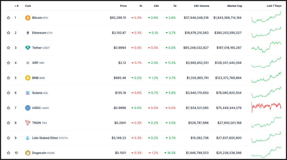 비트코인 외에도 스테이블코인을 제외한 시총 상위 코인 모두 상승 흐름을 보이고 있는데요. 상승장에서 흔히 그렇듯 이더리움, 솔라나 등 알트코인은 비트코인보다 높은 수익률을 보이고 있습니다.