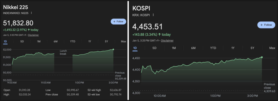 다만 현재 상승세는 암호화폐만의 단독 랠리라기보다는, 이른바 ‘에브리싱 랠리’ 흐름 속에서 나온 반등으로 해석되고 있습니다. 실제로 오늘 아시아 증시 역시 코스피와 닛케이가 3%대 강세를 보이고 있습니다.