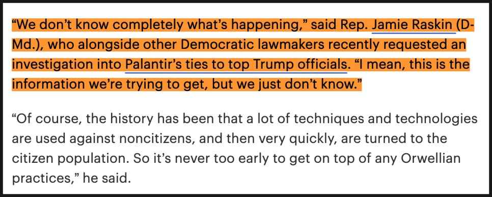 문제는 이 과정에서 어떤 데이터가 어떻게 활용되는지, 또 외부 데이터 소스까지 결합되고 있는지에 대해 명확한 설명이 부족하다는 점입니다. 민주당 소속 알렉산드리아 오카시오-코르테스(Alexandria Ocasio-Cortez) 의원과 제이미 래스킨(Jamie Raskin) 의원 등은 이 부분을 강하게 문제 삼으며, 사실상 미국 시민을 포함한 대규모 데이터 수집과 감시로 이어질 수 있다는 우려를 제기했습니다.