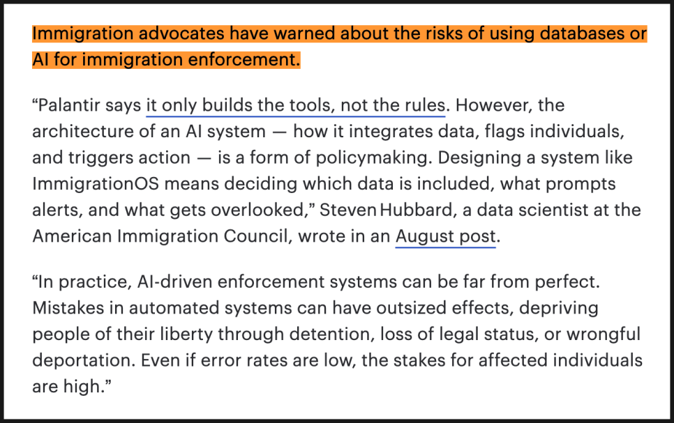 더 힐이 집중 조명한 부분은 미국 이민세관단속국, 그러니까 ICE와의 계약입니다. 팔란티어는 올해 4월 ICE와 약 3천만 달러 규모의 계약을 맺고, 이른바 ‘이민 라이프사이클 운영 시스템’, ImmigrationOS를 구축하고 있습니다. 쉽게 풀면 이민자들의 체류 상태, 자진 출국 여부, 체포 대상 선정, 추방 절차를 데이터로 관리하고 효율화하는 시스템입니다. 데이터 분석 회사 입장에서는 자연스러운 사업 영역일 수 있지만, 정치적으로는 가장 민감한 분야 중 하나죠.