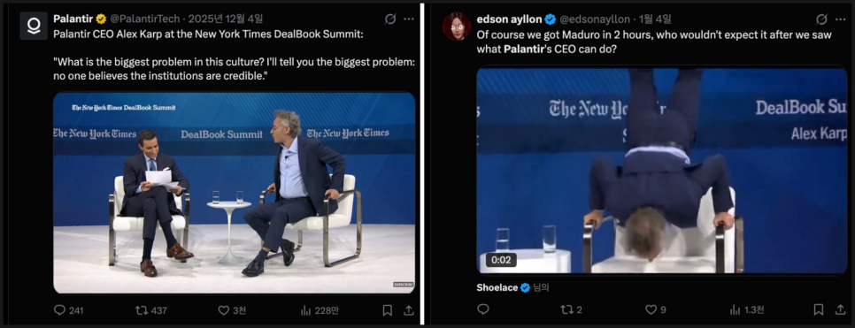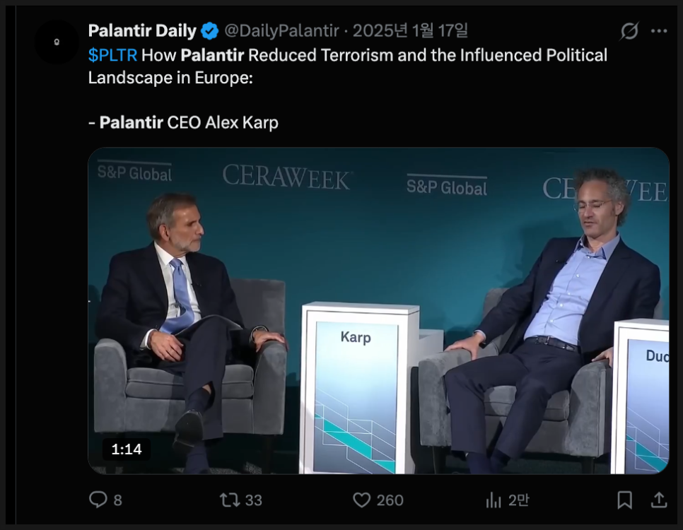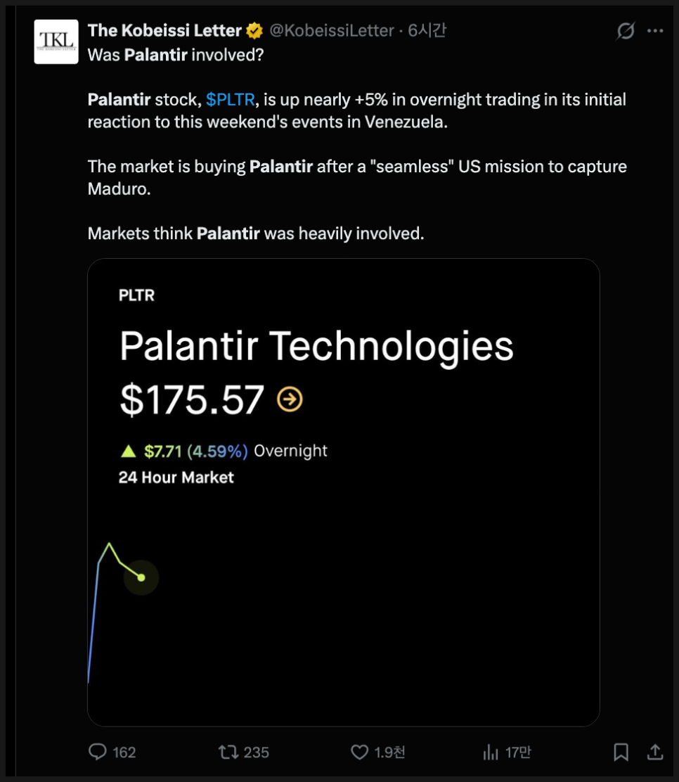 다만 이런 반응은 어디까지나 투자자들의 추정과 기대에 기반한 것입니다. 팔란티어는 정부와 군, 정보기관을 주요 고객으로 두고 있는 데이터 분석 기업이기 때문에, 글로벌 분쟁이나 군사 작전과 관련된 뉴스가 나올 때마다 자연스럽게 이름이 거론되기도 합니다. 팔란티어의 소프트웨어는 방대한 정보를 통합해 상황 판단과 의사결정을 돕는 데 특화돼 있는데요. 이 때문에 실제 사용 여부와 무관하게, “이런 작전이라면 팔란티어가 쓰였을 것”이라는 추론이 반복적으로 등장하는 경향이 있습니다.