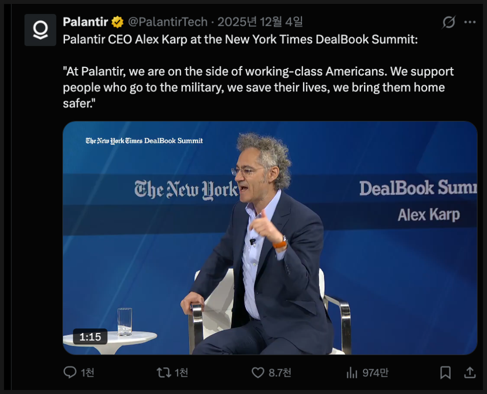 팔란티어는 이런 비판에 대해 일관된 입장을 유지하고 있습니다. 회사 측은 “우리는 데이터를 통제하지 않으며, 정부가 법적·윤리적 범위 내에서 데이터를 운영하도록 돕는 도구만 제공한다”는 주장을 반복해왔죠. 최고경영자 알렉스 카프(Alex Karp) 역시 지난해 말 뉴욕타임스 딜북 서밋에서 팔란티어는 감시를 목적으로 데이터베이스를 구축하지 않으며, 다만 합법적 감시로 수집된 데이터가 자사 제품에 입력될 수는 있다고 설명했습니다. 물론 합법이긴 하지만, 활용 범위가 어디까지 넓어질 수 있는지 명확하지 않아 논란이 되는 부분이죠.