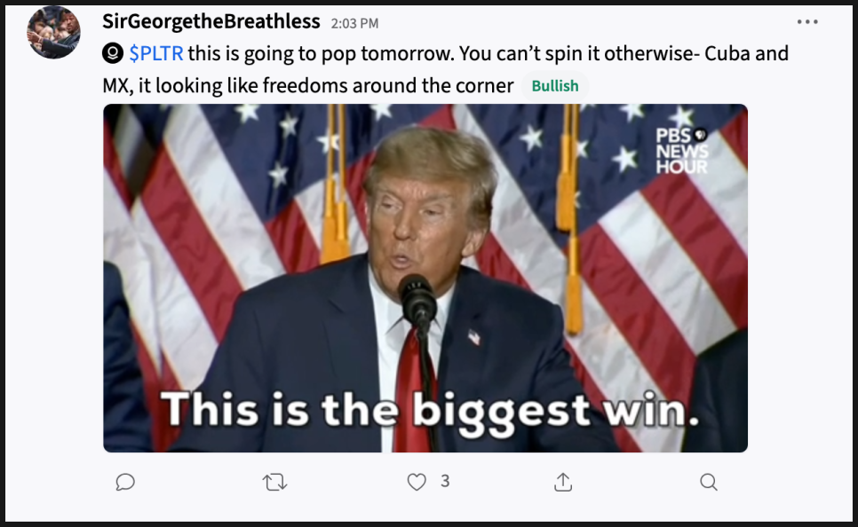 이 소식이 전해진 직후, 미국 개인 투자자들이 많이 모이는 커뮤니티에서는 팔란티어 관련 게시물이 급증했습니다. 일부 이용자들은 이번 작전에 팔란티어의 분석 소프트웨어가 사용됐을 가능성을 제기했고, 이를 근거로 주가 상승을 기대하는 반응을 보였습니다. 실제로 커뮤니티 내 투자 심리는 ‘강세(bullish)’ 구간으로 이동했고, 메시지량도 단기간에 크게 늘어났습니다. “PLTR, 방산과 사이버 보안 종목들 내일 랠리 예상”이라는 글이나, “이번 주말 트럼프 행보의 두뇌는 팔란티어였을 것”이라는 다소 과감한 해석까지 등장했죠.