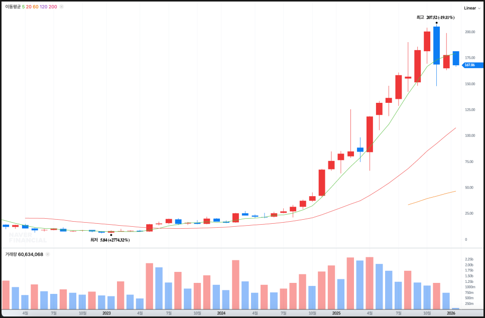 최근 고점 대비 조정 폭이 체감상 크게 느껴질 수는 있지만, 월봉 기준으로 보면 여전히 상승 추세 안에서의 조정으로 해석할 여지가 큽니다. 장기 투자자 입장에서는 과열 이후 숨 고르기 정도로 받아들이는 시각도 충분히 가능한 구간입니다.