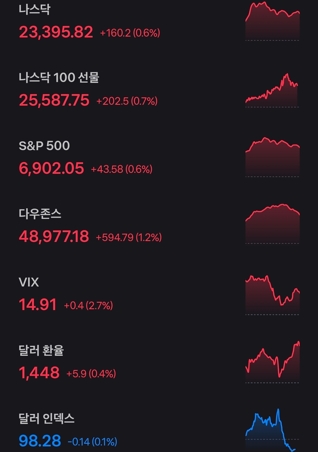 주요 지수는 나스닥 23,395.82로 0.6% 상승했고 S&P 500은 6,902.05로 0.6% 올랐으며 다우는 48,977.18로 1.2% 상승해 상대적 강세를 보였습니다. 변동성 지표인 VIX는 14.91로 2%대 상승해 지수 상승에도 시장이 완전히 안심한 분위기는 아니었습니다. 또한 VIX가 10대 중반에 머문다는 점은 공포가 구조적으로 크지 않다는 신호이지만 상승률이 붙었다는 점은 옵션 헤지 수요가 조금씩 늘었다는 의미로도 해석됩니다. 달러 인덱스는 98.28 수준에서 약세였지만 원달러 환율은 1,448원대로 올라 국내 투자자 입장에서는 달러 자산의 원화 환산이익이 커질 수 있는 동시에 추가 매수의 체감 가격이 높아지는 양면성이 나타납니다. 심리 지표는 47의 중립 구간이며 직전 44 수준에서 소폭 개선된 흐름이라서 과열보다는 경계와 기대가 균형을 이루는 모습입니다. 그만큼 한두 가지 이슈로 쏠림이 생기면 되돌림도 빠르게 나타날 수 있습니다.