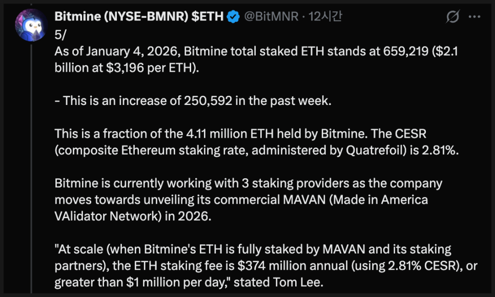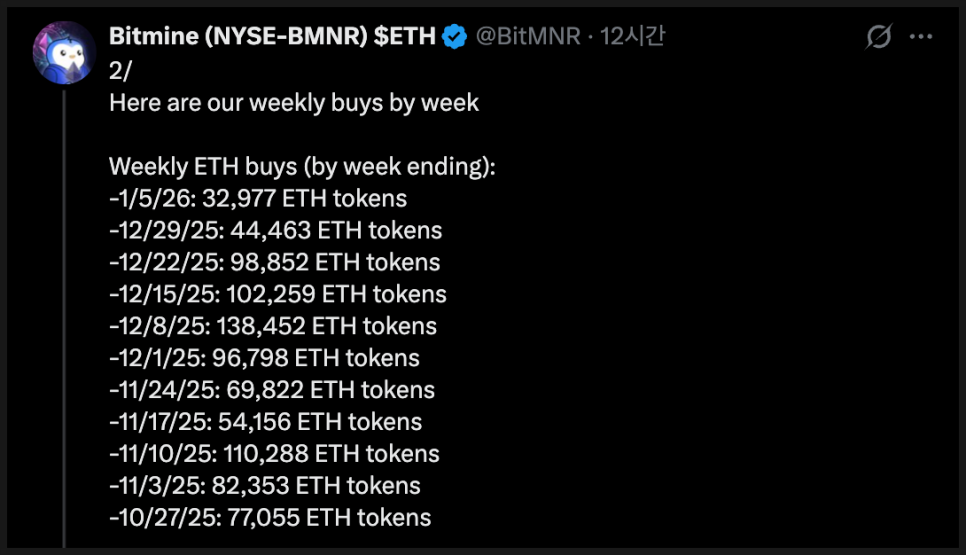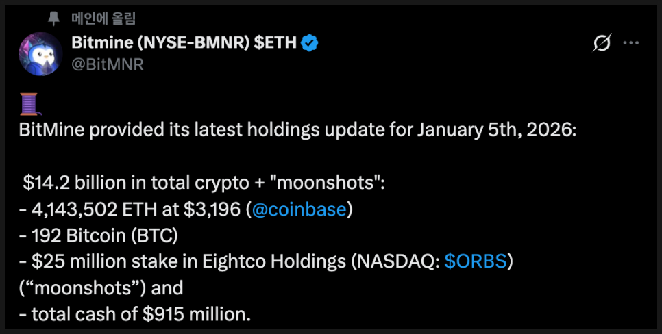 한편 톰 리가 이사회 의장으로 있는 비트마인 이머전 (BitMine Immersion)이 또 한 번 대규모 이더리움 매입을 공개했습니다.