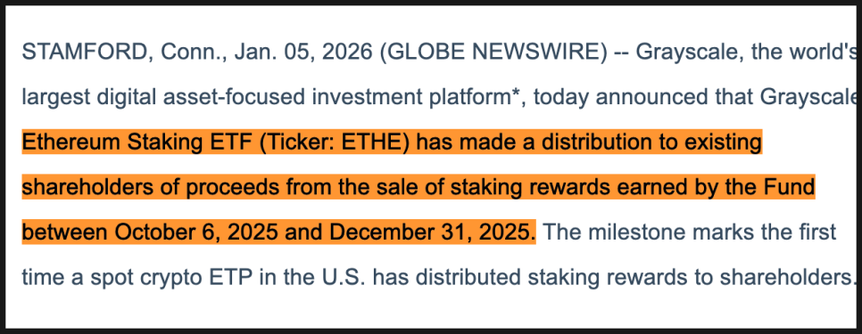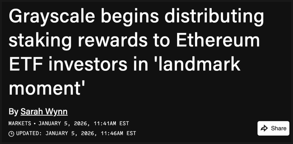 그레이스케일은 월요일 성명을 통해, 자사의 그레이스케일 이더리움 스테이킹 ETF가 스테이킹 보상을 주주에게 직접 전달한 미국 최초의 이더리움 ETF라고 밝혔습니다. 투자자들은 보유 주식 1주당 0.083178달러를 받게 되며, 지급일은 1월 6일입니다.