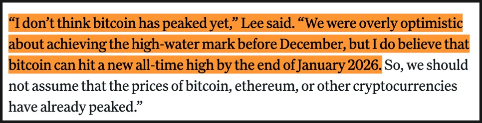 한편 톰 리는 이번에 또 CNBC 인터뷰에서 “비트코인은 아직 정점을 찍지 않았다”고 말했습니다. 그러면서 2026년 1월 말 안에 비트코인이 다시 한 번 사상 최고가를 경신할 수 있다고 재언급했습니다.