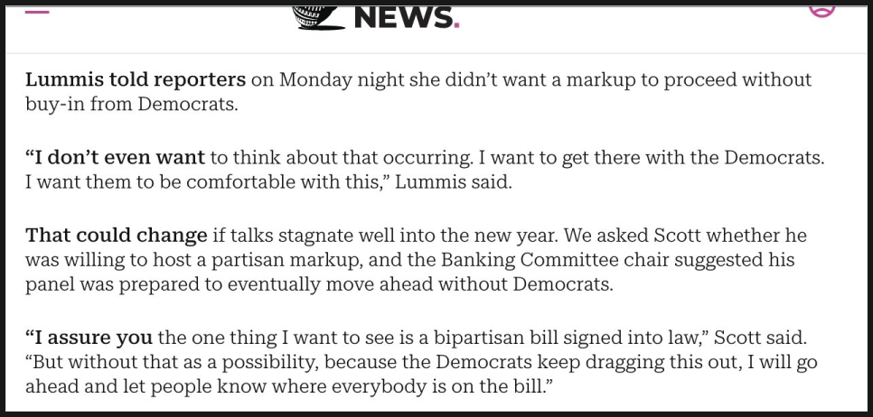 이에 대해 팀 스콧 위원장은 여전히 초당적 합의를 원한다고 강조하면서도, 더 이상의 지연이 생기면 위원회 차원에서 입장을 명확히 하기 위해 단독 마크업도 고려할 수 있다는 여지를 남겼습니다. 합의가 최선이지만, 합의가 안 되면 누가 찬성하고 누가 반대하는지라도 보여주겠다는 의미로 해석됩니다.