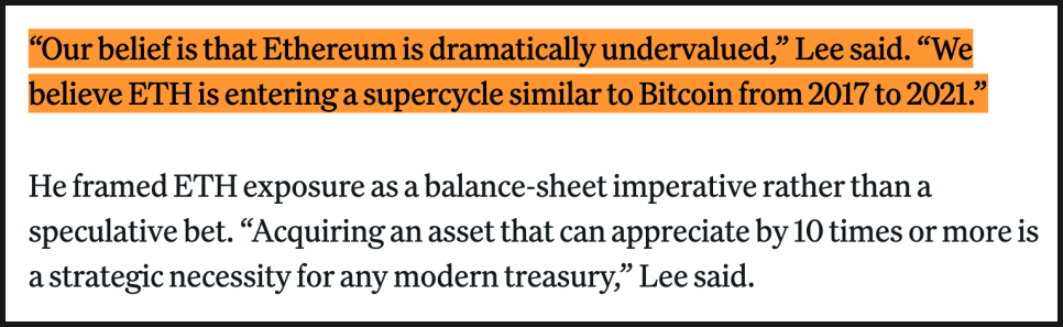 이더리움에 대한 시각은 여전히 강합니다. 톰 리는 이더리움이 비트코인이 2017년부터 2021년까지 겪었던 대세 상승 구간과 비슷한 국면에 들어가고 있다고 주장했습니다. 그는 이더리움이 “극단적으로 저평가돼 있다”고 표현하면서, 장기적으로는 10배 이상 오를 수 있는 자산이라고 봤습니다.