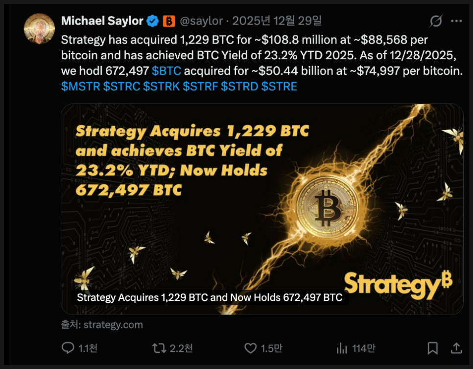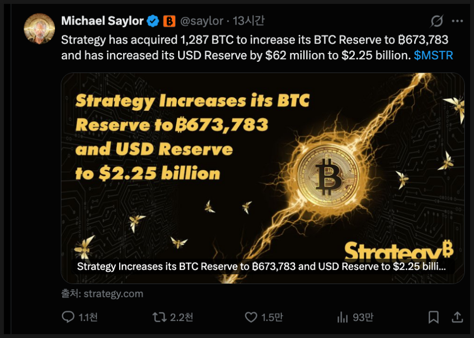 스트래티지는 불과 일주일 전에도 약 1,229개의 비트코인을 평균 8만8,568달러에 매입했다고 발표한 바 있습니다. 말 그대로 쉬지 않고 쌓고 있는 셈입니다.