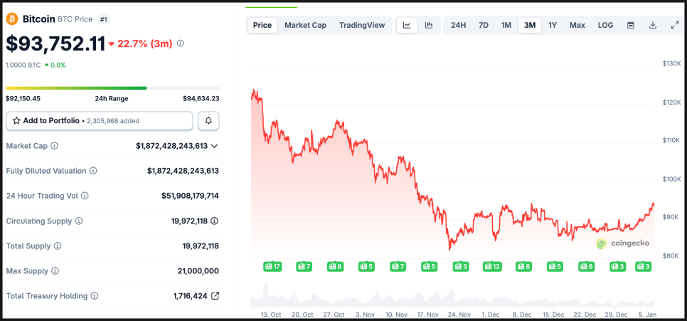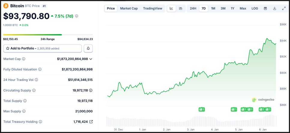 이제 다시 비트코인 얘기를 해보겠습니다. 비트코인은 이번 주 초부터 강한 흐름을 보이며 2026년 들어 최고가인 9만4천 달러까지 올라갔습니다. 미국 주식 시장이 개장한 뒤에도 강세를 이어갔고 9만4천 달러를 찍은 뒤 소폭 되돌림이 있었지만, 상승분 대부분은 지켜내고 있습니다.