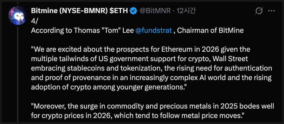 이번 매수 발표에서 비트마인은 톰 리 의장의 말을 인용하며 2026년 이더리움 전망을 상당히 낙관적으로 보고 있습니다. 그는 미국 정부의 친크립토 기조, 월가의 스테이블코인과 토큰화 수용, AI 시대에 필요한 인증과 데이터 출처 증명 수요 증가, 그리고 젊은 세대를 중심으로 한 암호화폐 채택 확대를 모두 긍정적인 요인으로 꼽았습니다. 여기에 2025년 동안 원자재와 귀금속 가격이 크게 오른 점도, 과거 흐름상 2026년 크립토 가격에 우호적으로 작용할 수 있다고 봤습니다.