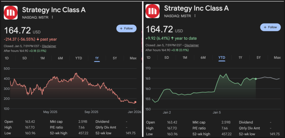 스트래티지 주가는 현재 165 달러에서 거래되고 있습니다. 올해는 6% 이상 상승하며 산뜻한 새해를 보내고 있습니다만, 지난 1년 간 55% 넘게 떨어졌죠. 같은 기간 비트코인은 6% 하락에 그쳤다는 점을 감안하면, 변동성이 얼마나 큰지 체감할 수 있습니다.