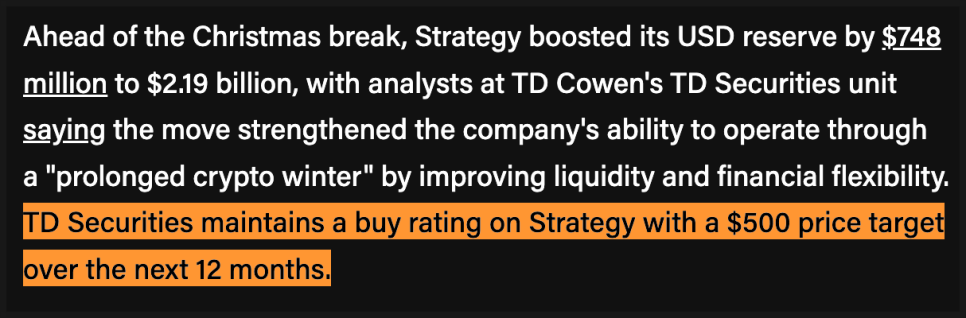 월가 쪽 시각도 흥미롭습니다. TD증권의 분석가들은 스트래티지가 연말에 대규모 현금을 확보한 것이 “길어질 수 있는 크립토 겨울을 버틸 체력과 유연성을 높였다”고 평가했습니다. 이들은 스트래티지에 대해 매수 의견을 유지하면서 12개월 목표주가를 500달러로 제시하고 있습니다.