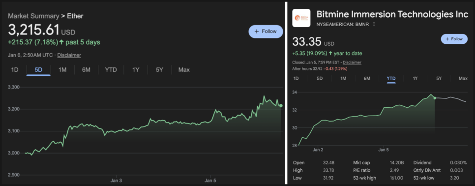 최근 이더리움이 일주일 동안 7% 넘게 상승하면서 비트마인 역시 주가가 상당히 반등하긴 했습니다. 새해 동안 19% 상승하며 33 달러 부근에서 거래되고 있습니다.