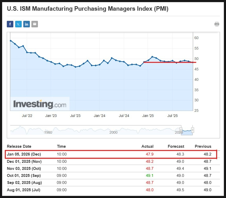 이번 상승이 더 눈에 띄는 이유는 같은 날 발표된 미국 제조업 지표가 분명히 부진했기 때문입니다. 미국 공급관리협회가 발표한 ISM 제조업 구매관리자지수는 47.9로 나왔습니다. 시장 예상치였던 48.3보다 낮았고, 기준선인 50을 한참 밑도는 수치입니다. 이로써 미국 제조업은 10개월 연속 수축 국면에 머물렀다는 신호를 다시 한 번 확인한 셈이죠.