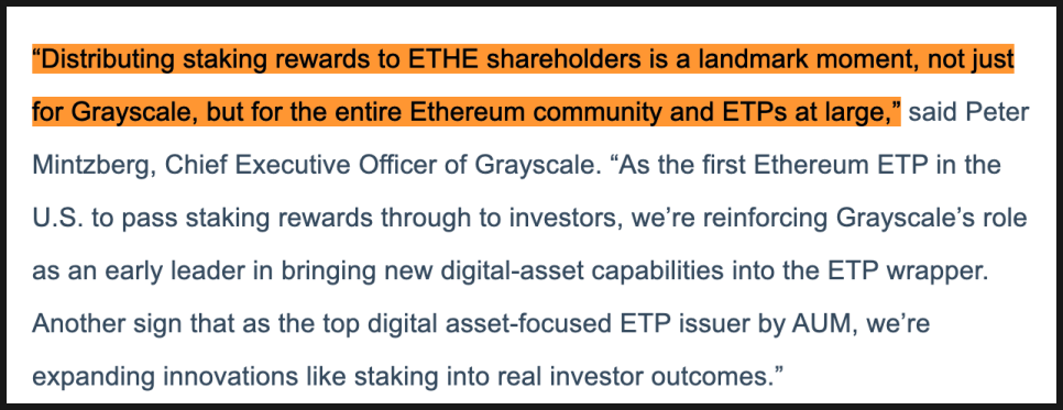 한편 그레이스케일이 이더리움 스테이킹 보상을 ETF 투자자에게 직접 현금으로 지급하기 시작했기 때문입니다.
