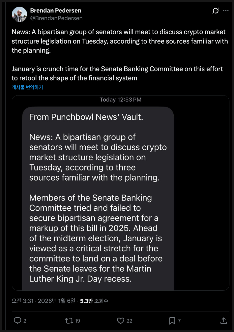 핵심은 이렇습니다. 미국 상원 은행위원회가 이번 달 안에 CLARITY 법안을 실제로 진전시킬 수 있느냐의 기로에 서 있고, 이를 위해 초당적 상원 회의가 화요일에 열릴 예정이라는 겁니다. 이 회의는 크립토 시장 구조를 어떻게 규제할지에 대한 이견을 좁히기 위한 자리로, 1월이 사실상 마지막 골든타임으로 인식되고 있습니다. 미국은 곧 마틴 루터 킹 데이 휴회가 시작되기 때문이죠.