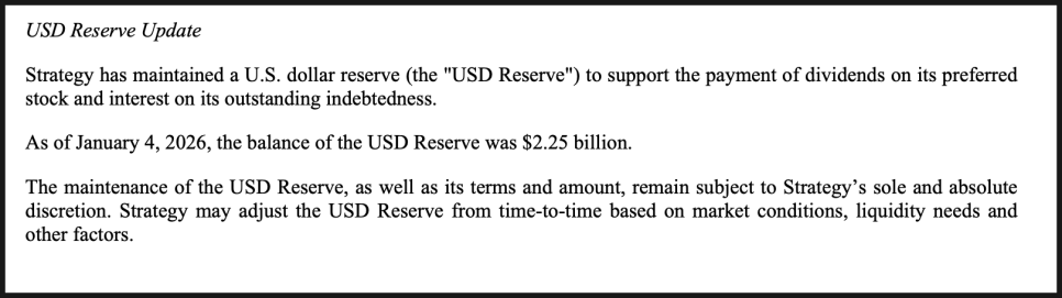 눈여겨볼 또 하나의 포인트는 달러 현금입니다. 스트래티지는 같은 기간 동안 달러 준비금 USD 리저브를 6,200만 달러 늘려 총 22억5천만 달러까지 쌓았습니다. 이 현금은 우선주 배당과 기존 부채 이자 지급을 위한 안전판 역할을 합니다. 참고로 회사는 크리스마스 직전에만 해도 이 준비금에 7억4,800만 달러를 한꺼번에 추가해 둔 상태였습니다.