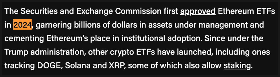 사실 이 흐름의 출발점은 2024년입니다. 당시 미국 증권거래위원회가 이더리움 ETF를 처음 승인하면서, 수십억 달러 규모의 자금이 유입됐고, 이더리움은 기관 투자 자산으로서의 지위를 확실히 굳혔습니다. 이후 트럼프 행정부 들어서는 도지코인, 솔라나, XRP를 추종하는 ETF까지 등장했고, 일부 상품은 스테이킹 기능도 함께 허용하고 있습니다.