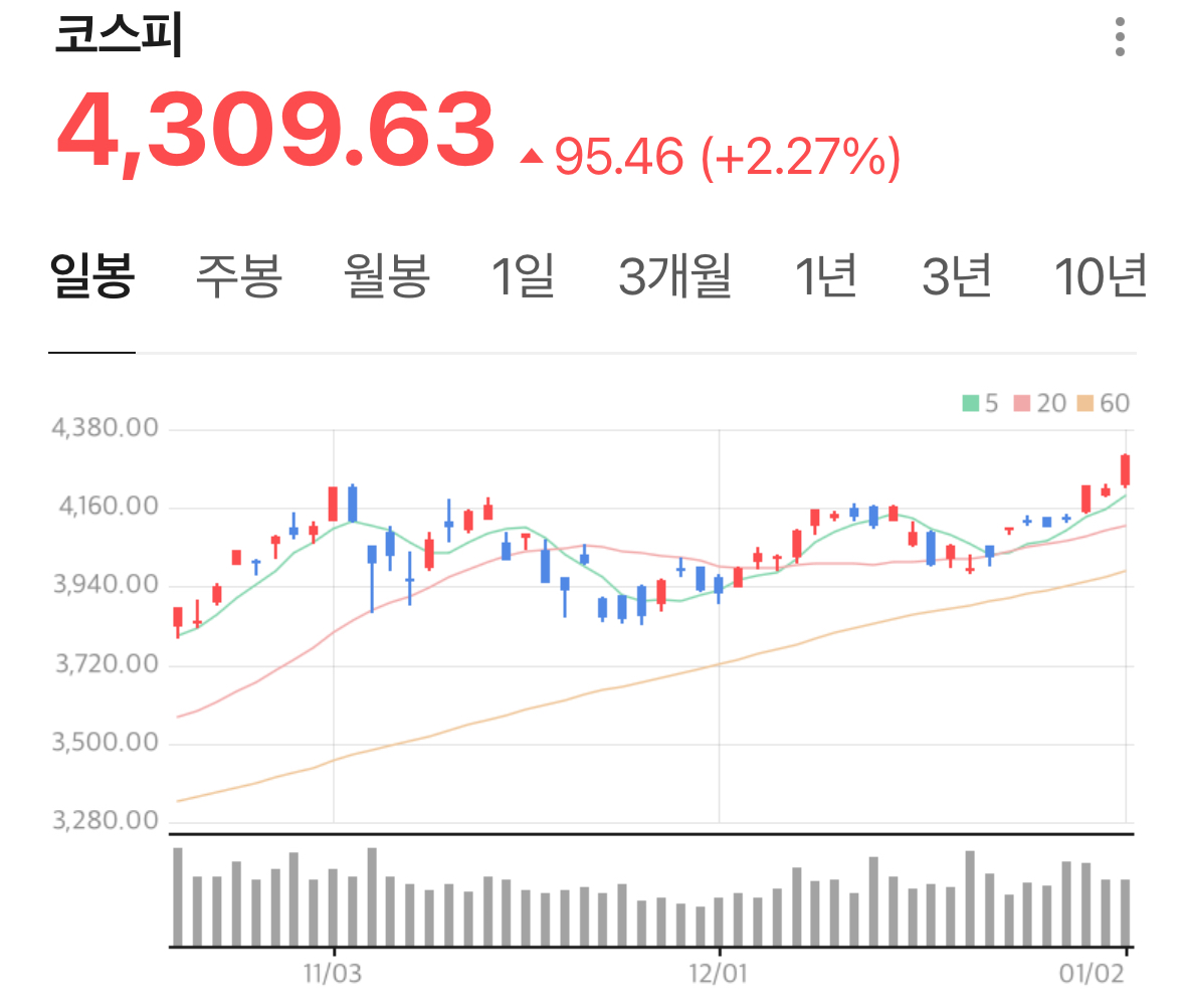 2026๋ ๋ณ์ค๋ (ไธๅๅนด)์ ์ฒซ ๊ฑฐ๋์ผ์ธ 1์ 2์ผ, ํ๊ตญ ์ฆ์๋ ์ํด๋ฅผ ํ์ฐจ๊ฒ ์ด์์ต๋๋ค. ์ฝ์คํผ๊ฐ ์ฅ์ค 4300์ ์ ๋ํํ๋ฉฐ ์ฌ์ ์ต๊ณ ์น๋ก ๋ง๊ฐํ๊ณ , ์ฝ์ค๋ฅ ์ญ์ ๊ฐ์ธ๋ฅผ ๋ณด์ด๋ฉฐ ํฌ์์๋ค์๊ฒ ํฌ๋ง์ฐฌ ์ถ๋ฐ์ ์๋ ธ์ต๋๋ค.