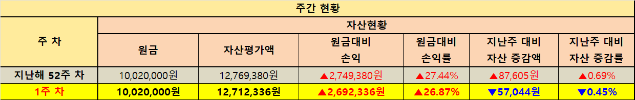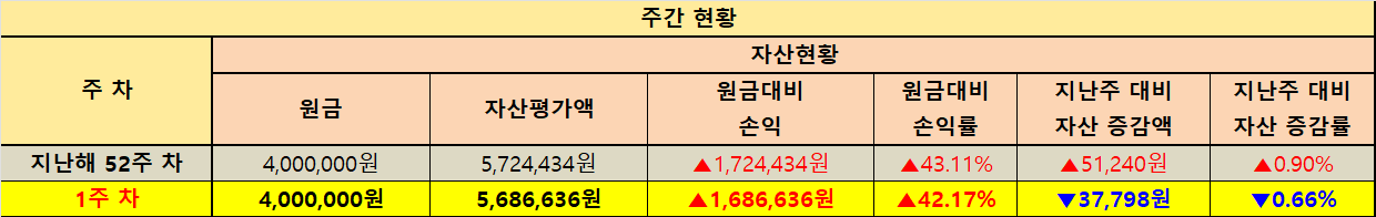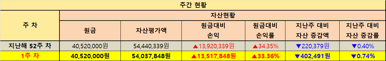전체 계좌 합산 기준 원금은 40,520,000원이며 1주차 자산평가액은 54,037,848원입니다. 원금 대비 손익은 +13,517,848원으로 손익률 +33.36%를 기록했습니다. 지난주인 지난해 52주차 자산평가액 54,440,339원과 비교하면 -402,491원이 감소했으며 증감률은 -0.74%입니다. 같은 방식으로 원금 대비 손익도 지난해 52주차 +13,920,339원에서 이번 주 +13,517,848원으로 -402,491원이 줄어든 흐름입니다.