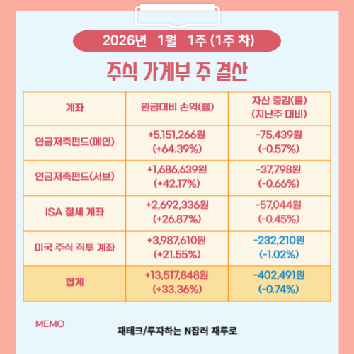 2026년 1월 1주차 주식 가계부를 결산해 보았습니다. 이번 주는 지난주 대비 자산이 감소한 구간이기 때문에 단순한 등락보다 ‘어느 계좌에서 얼마나 움직였는지’를 분리해서 확인하면서 제 투자 원칙이 흔들리지 않도록 기록을 정리해 보겠습니다.