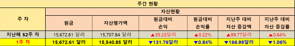 달러 기준 계좌는 원금 15,672.61달러 대비 1주차 자산평가액 15,540.85달러입니다. 원금 대비 손익은 -131.76달러이며 손익률 -0.84%로 정리됩니다. 지난해 52주차 자산평가액 15,707.84달러에서 1주차 15,540.85달러로 -166.99달러가 반영되었고 증감률은 -1.06%입니다. 해외 자산은 원화 환산값과 달러 기준 값이 동시에 존재하기 때문에 기록 단계에서부터 기준을 분리해 두는 것이 중요합니다. 그래야 원화 기준의 변동이 환율 때문인지 자산 가격 때문인지 판단의 출발점이 흔들리지 않습니다. 이번 주는 달러 기준에서도 감소가 확인되었으니 자산 가격 변동이 존재했던 구간으로 깔끔하게 기록해 두겠습니다.