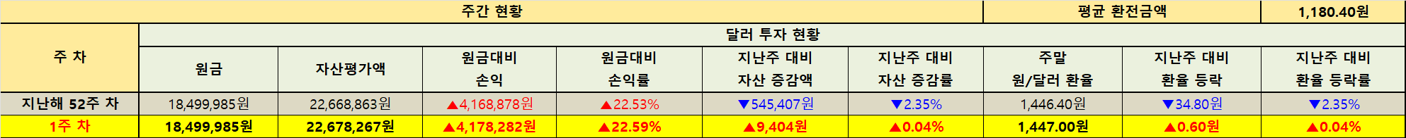평균 환전금액은 1,180.40원이며 주말 원/달러 환율은 1,447.00원입니다. 지난주 대비 환율 등락은 +0.60원이며 등락률은 +0.04%입니다. 환차손익 항목은 원금 18,499,985원 대비 1주차 자산평가액 22,678,267원으로 원금 대비 손익 +4,178,282원 손익률 +22.59%입니다. 지난해 52주차 자산평가액 22,668,863원에서 1주차 22,678,267원으로 +9,404원이 증가했고 증감률은 +0.04%입니다.