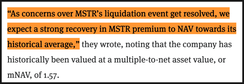 한편 투자은행 번스타인 Bernstein의 애널리스트들은 이 프리미엄이 다시 과거 평균 수준으로 회복될 가능성이 높다고 분석했습니다. 핵심 전제는 단 하나, 비트코인 가격 회복인데요. 번스타인 쪽은 이 우려가 점차 해소되면, 스트래티지의 프리미엄이 순자산가치 대비 과거 평균 수준으로 돌아갈 수 있다고 봤습니다. 과거 스트래티지는 순자산 대비 약 1.57배, 그러니까 보유 자산 가치보다 훨씬 높은 평가를 받아온 시기가 많았다는 점을 근거로 들었습니다.