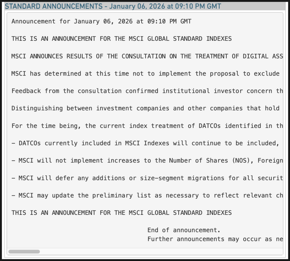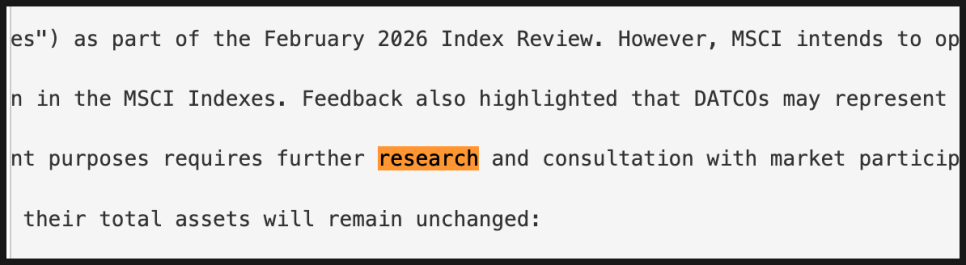 당분간은, 디지털 자산 보유액이 총자산의 50% 이상을 차지하는 기업으로 MSCI가 예비 목록에 식별한 DATCO들에 대한 현행 지수 처리 방식은 유지됩니다.