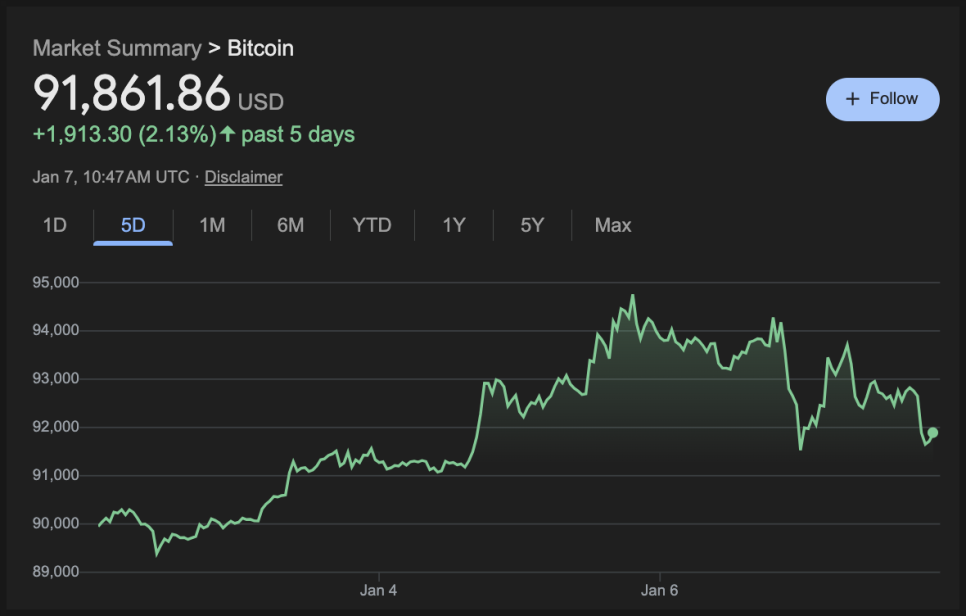 흥미로운 점은 비트코인 가격도 이 소식에 반응했다는 겁니다. 장중 내내 눌려 있던 비트코인은 반등하면서 9만4천 달러 이상까지 올라갔습니다. 다만 현재 시점에서는 조정이 진행 중입니다.