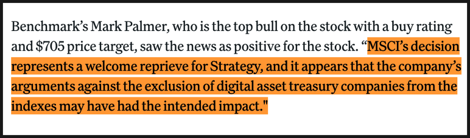 스트래티지에 가장 강한 낙관론을 가진 쪽으로 알려진 벤치마크 Benchmark의 마크 팔머 Mark Palmer 역시 이번 소식을 주가에 긍정적인 재료로 해석했습니다. MSCI가 결정을 유보한 것은 스트래티지 입장에서 반가운 휴식이며, 디지털 자산 재무 기업을 지수에서 제외하면 안 된다는 회사 측의 논리가 어느 정도 먹혔을 가능성이 있다는 평가입니다. 그는 매수 의견에 목표 주가 705달러를 제시하고 있습니다.