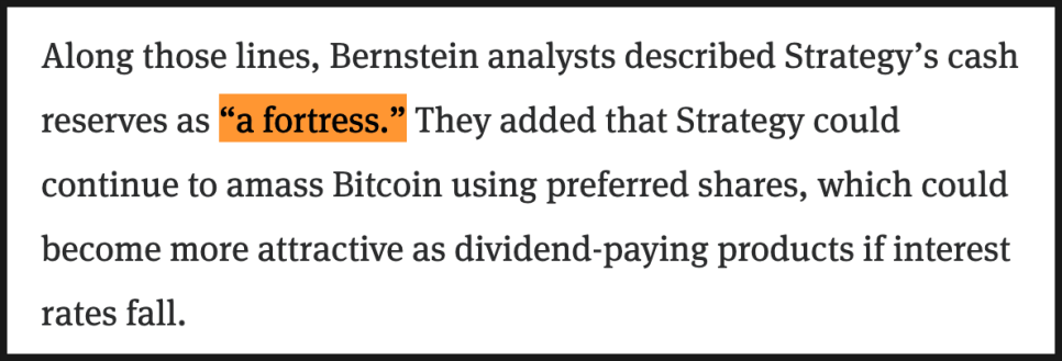 번스타인은 스트래티지의 현금 상황을 “요새 같은 재무 구조”라고 표현했습니다. 금리가 내려간다면, 배당을 주는 우선주가 오히려 더 매력적인 자금 조달 수단이 될 수 있다는 분석도 덧붙였습니다.