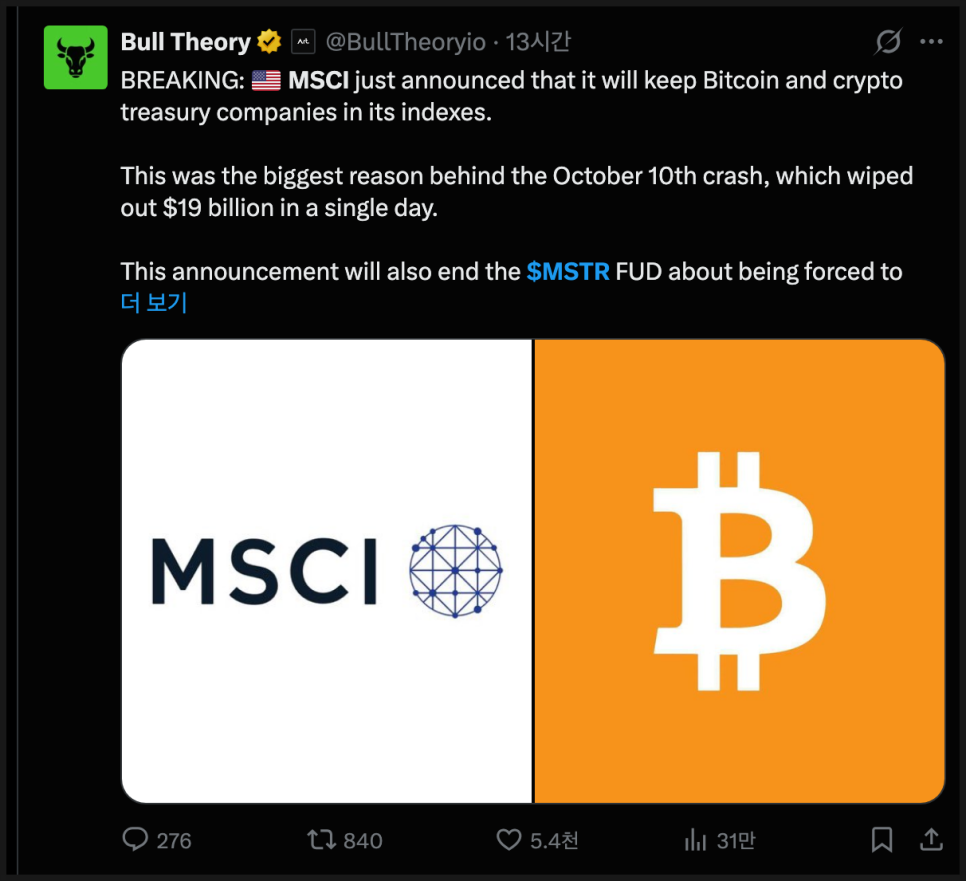 그래서 만일 이번 이슈로 MSTR 주가가 오르더라도, 앞으로 MSCI가 어떤 기준을 만들지, 그리고 그 기준이 시장에 어떤 영향을 줄지를 계속 지켜볼 필요가 있습니다.