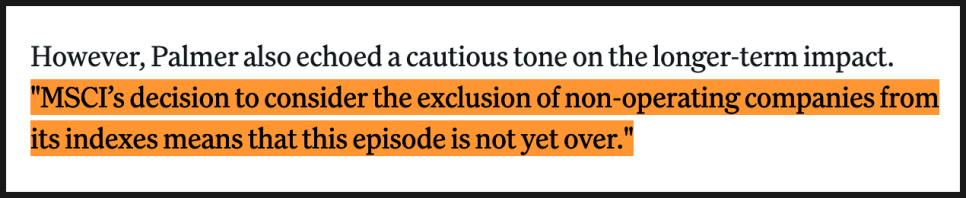다만 팔머 역시 MSCI가 비영업 자산을 중심으로 움직이는 기업들, 다시 말해 본업이 아닌 자산 보유가 핵심이 된 기업들을 지수에서 어떻게 다룰지 재검토하겠다는 입장을 유지하고 있다는 점을 짚었습니다. 이 말은 이번 이슈가 완전히 끝난 게 아니라는 뜻이기도 하죠.