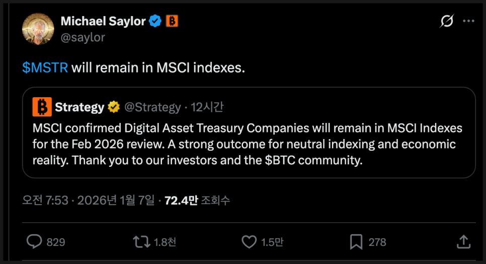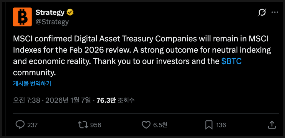 그런데 이날, MSCI가 2026년 2월 정기 리뷰에서도 디지털 자산 트레저리 기업들이 MSCI 지수에 계속 포함된다고 밝힌 겁니다. 스트래티지 공식 계정에서는 이를 두고 '중립적 인덱싱과 경제적 현실을 모두 반영한 긍정적인 결과'라며 '투자자 여러분과 비트코인 커뮤니티에 감사드립니다'고 전했습니다.