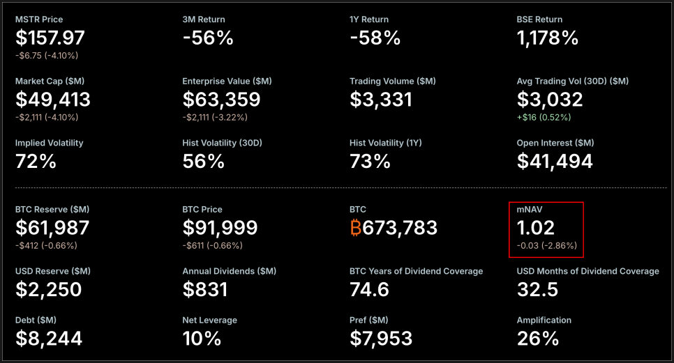 이 프리미엄이 중요한 이유는 구조적인 성장 메커니즘 때문입니다. 프리미엄이 높을수록 스트래티지는 주식을 발행해 자금을 조달하고, 그 돈으로 비트코인을 더 살 수 있습니다. 주당 비트코인 보유량을 늘리는 선순환이 가능한 구조죠. 그런데 작년 하반기부터 이 프리미엄이 빠르게 낮아지면서, 최근에는 1.02 수준까지 내려왔습니다. 거의 “자산 값 그대로” 거래되고 있다는 뜻입니다.