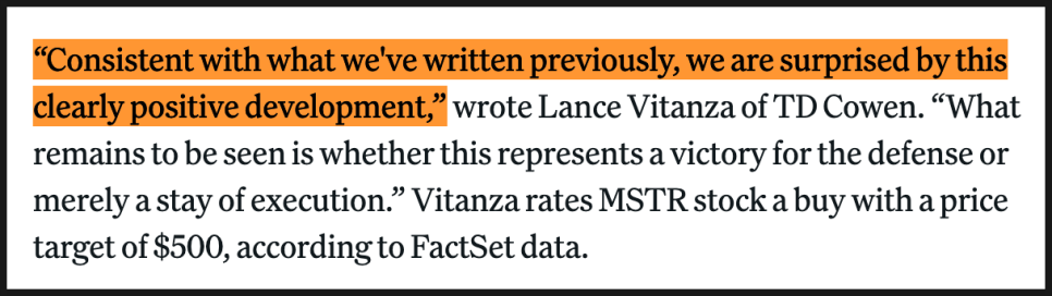 실제로 애널리스트들의 반응을 보면 마냥 안심하기는 이르다는 분위기입니다. TD 코웬 TD Cowen의 애널리스트 랜스 비탄자 Lance Vitanza는 이번 결정을 명확히 긍정적인 변화라고 놀랐다고 평가하면서도, 이게 완전한 승리인지 아니면 집행 유예에 불과한지는 아직 알 수 없다고 표현했습니다. 쉽게 말해, 한 고비는 넘겼지만 근본적인 판결이 나온 건 아니라는 의미죠. 그는 스트래티지 주식에 대해 매수 의견을 유지하고 있으며, 목표 주가는 500달러로 제시하고 있습니다.
