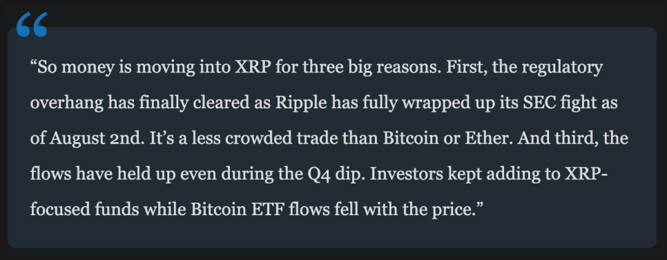 맥켄지 시갈로스는 XRP로 자금이 유입되는 이유를 세 가지로 정리했습니다. 먼저, 리플이 미국 증권거래위원회와의 법적 분쟁을 지난해 8월 완전히 마무리하면서 규제 불확실성이 해소됐다는 점입니다. 두 번째는 비트코인이나 이더리움에 비해 상대적으로 경쟁이 덜한 투자 대상이라는 점이고요. 세 번째는 지난해 4분기 시장이 흔들릴 때도 자금 흐름이 꺾이지 않았다는 점입니다. 비트코인 ETF로는 자금이 빠져나갔지만, XRP 관련 펀드에는 오히려 돈이 계속 들어왔다는 설명이죠.